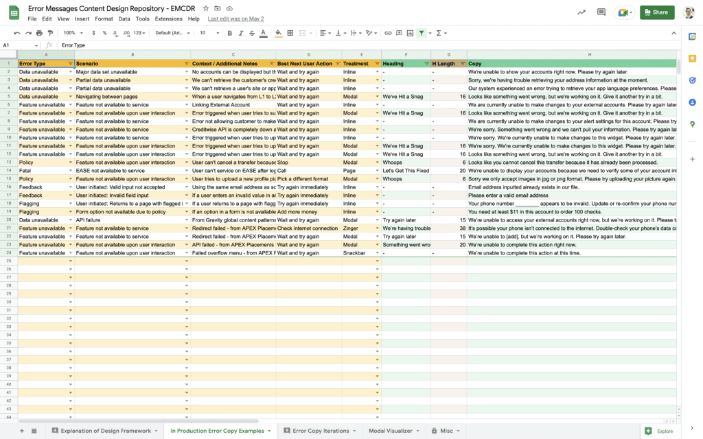 The reason for the spreadsheet: error messages across our organization were in a disorganized state. There were some helpful tips scattered across a handful of sources. Some of them featured examples with language that we would like to phase out.