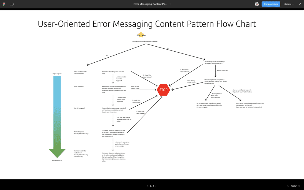 But before I got started on the first draft, I spent a little time organizing my thoughts in a flow chart. I was noticing a hierarchy in error message writing that I wanted to explore.