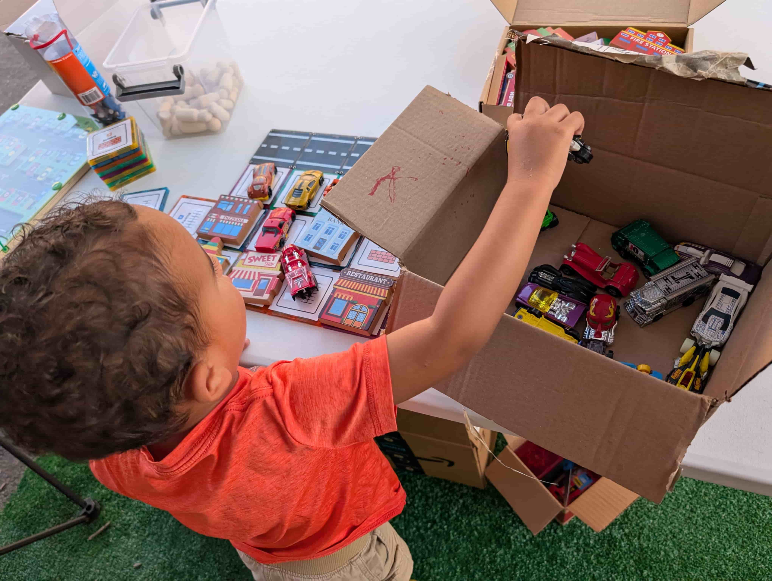 I had the idea of printing off labels and taping them to my son’s Magna-tiles. The tiles were just the right size to hold Hot Wheels cars. Plus, the magnetic click was very satisfying.